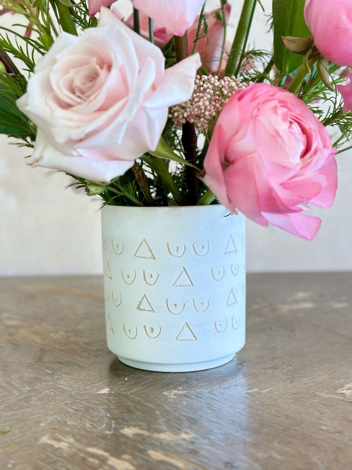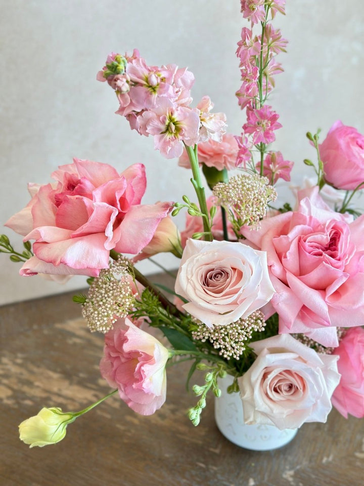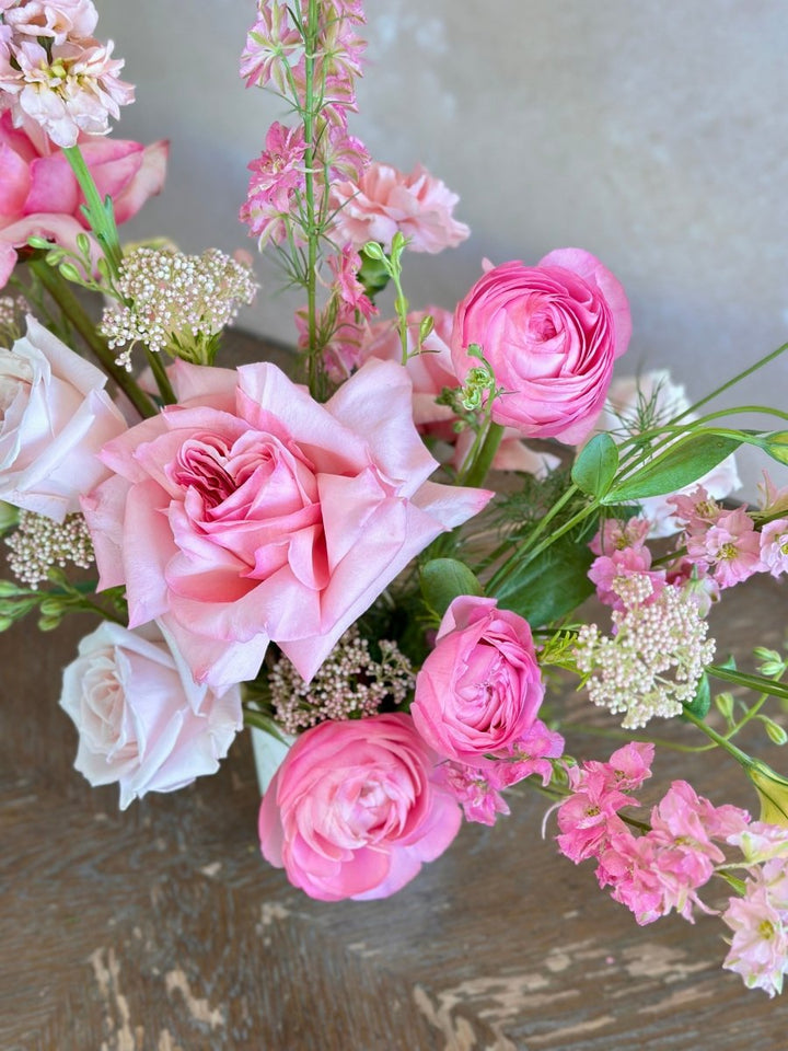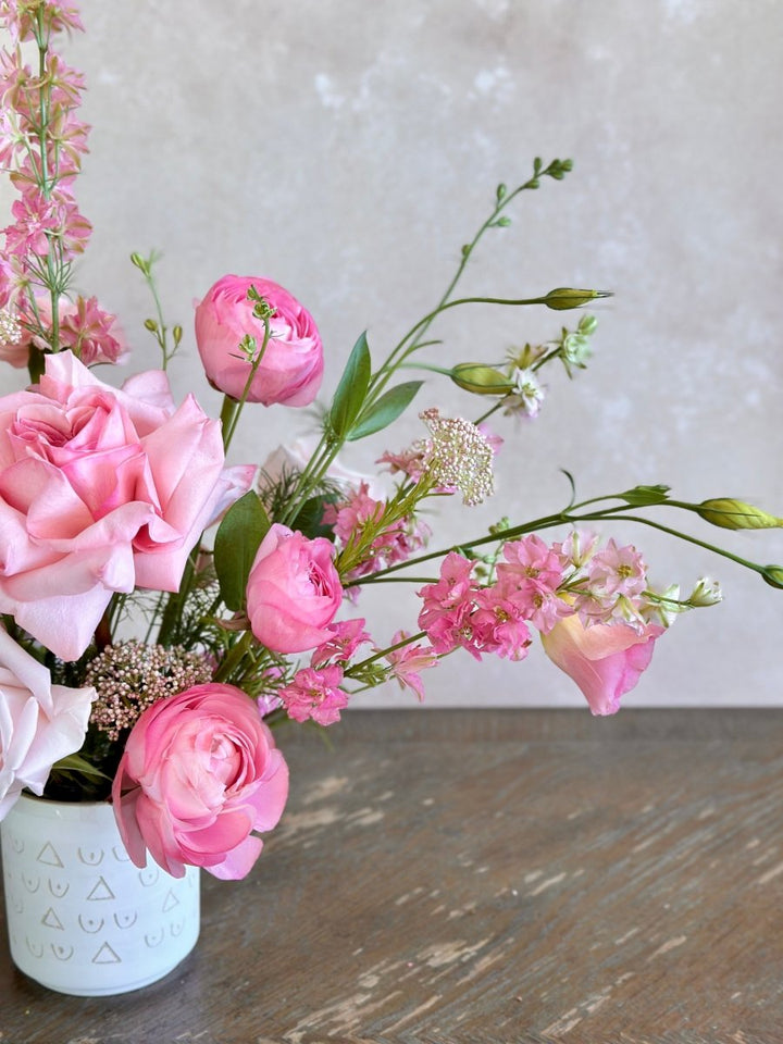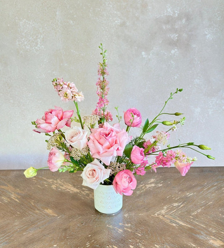 Celebrate strength, resilience, and hope with this pink floral arrangement designed exclusively for Breast Cancer Awareness Month. Handcrafted by our Los Angeles florists, this bouquet features a lush blend of pink roses, ranunculus, lisianthus, stock, and seasonal fillers, all thoughtfully arranged in a cute 3"x3.5" boobies artisan vase.