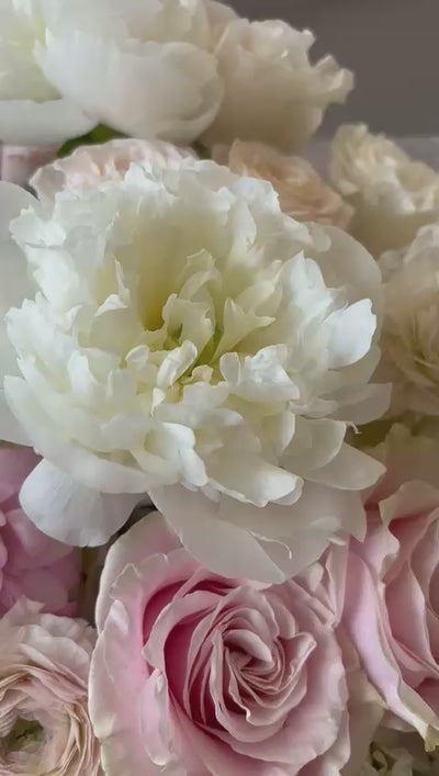 A soft, romantic bouquet featuring lush white peonies and delicate blush ranunculus, accented with garden roses and seasonal blooms in creamy ivory and pink tones.